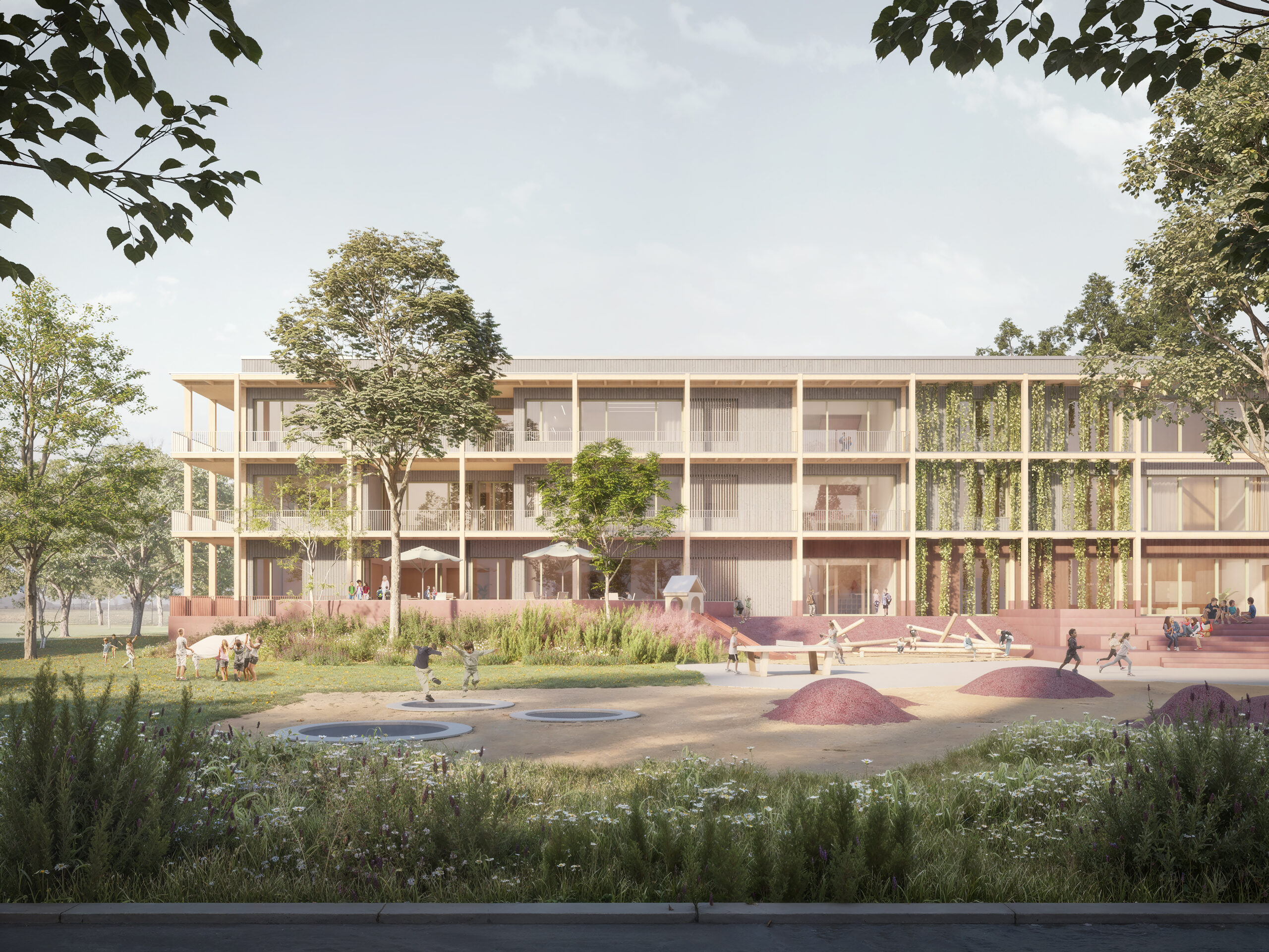 Das neue Schulgebäude für Lauenförde orientiert sich als markanter, dreigeschossiger Riegel am nördlichen Rand des Plangebiets, wodurch ein gemeinsamer Eingangsbereich mit der bestehenden Kita entsteht.